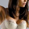 A very glamorous delicate balconette Bra. The cup edges are decorated with foliage embroidery and tiny Swarovski crystals. Supportive boning at the wings and silicone strap under the bust provides a great shape. Adjustable and removable straps. Removable pads included. An absolute must have in your bridal collection. Matching thong and suspender belt available separately. Item packaged in a Gracya Box. Available in White or Cream.