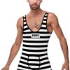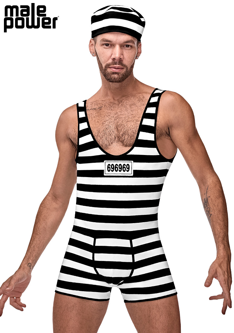 From the Costumes collection by Male Power, this style includes: A prisoner themed one-piece singlet with a cutout rear, low-cut back, prisoner patch #, and a matching cap. Smooth nylon with four way stretch spandex , plush elastic trim Hand Wash Separately, Cold Water, Line Dry, Do Not Bleach