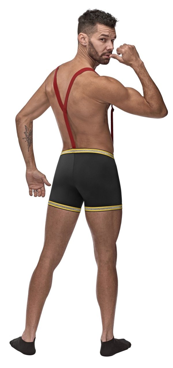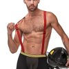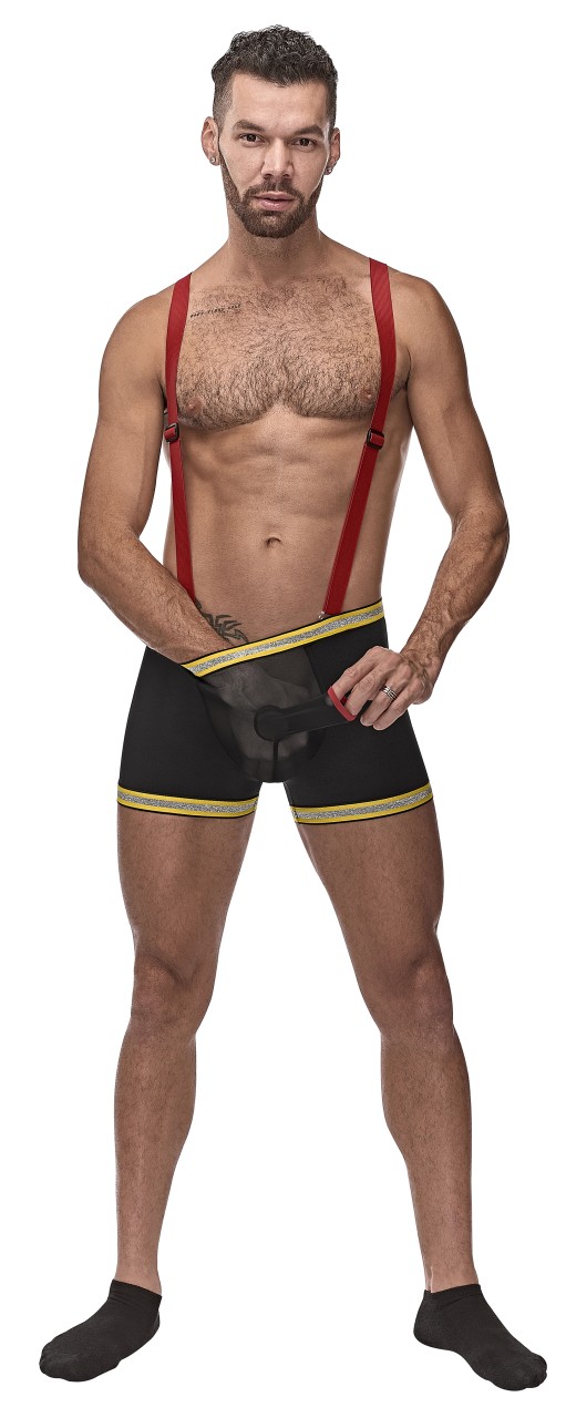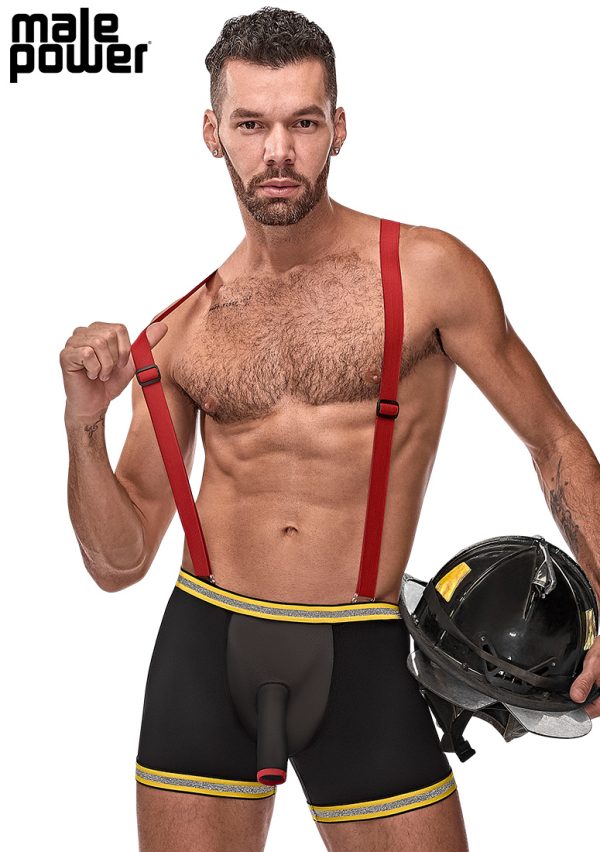 From the Costumes collection by Male Power, this style includes: A firefighter themed costume including adjustable suspender shorts with a sheer stretch mesh open shaft pouch and sparkle elastic trim. Solid nylon spandex with stretch nylon mesh and sparkle striped plush elastic trim. Hand Wash Separately, Cold Water, Line Dry, Do Not Bleach