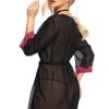 A lovely robe made from slightly transparent chiffon. The collar and cuffs are decorated with beautiful pink lace. The dressing gown is tied with a matching black belt. This item arrives packaged in a lovely Irall box. Please note the thong is not included but is available with the matching babydoll which is available separately, please see related products.