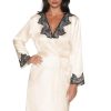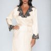 This pretty short style satin dressing gown looks sophisticated in a lovely warm cream colour. Deep black lace decorates the neck and sleeves. This item arrives packaged in an Irall box making it ideal as a gift or treat. The Juniper collection comprises dressing gowns and matching nightdresses in burgundy or cream. Please see the ‘Related Products’ tab below for further details.