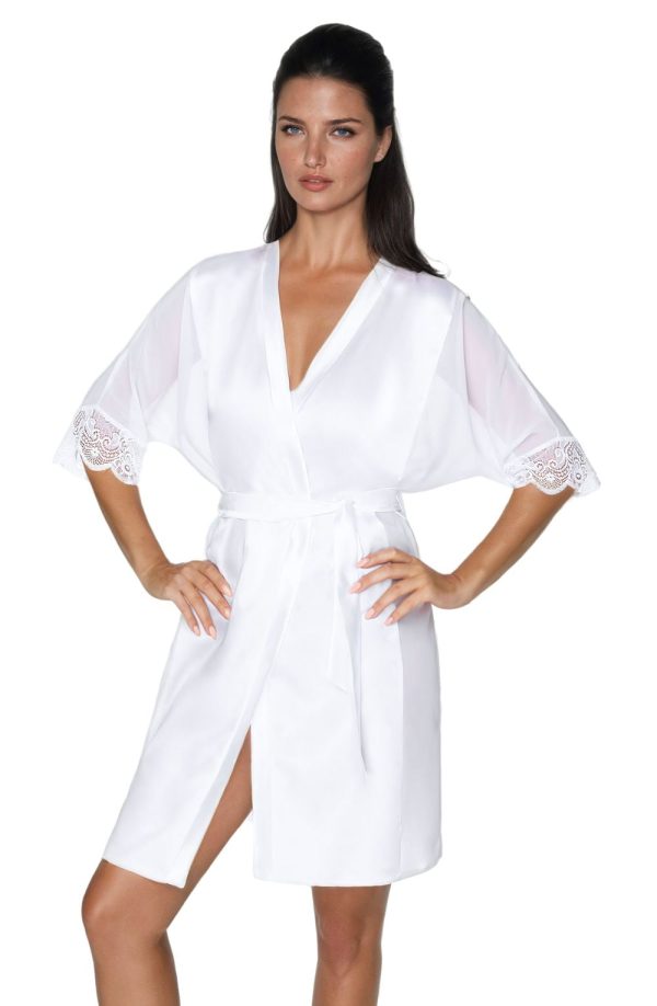 An original bathrobe in which the satin is combined with transparent chiffon giving it an elegant style. Front back and belt are made of the highest quality satin. The sides and kimono sleeves are sewn from transparent chiffon. The sleeves are finished with beautiful lace. The length of the dressing gown measured from the collar to the hem is 93 cm. Arrives packaged in an Irall box making it ideal as a gift or treat. The Sharon collection comprises Nightdress or Dressing gown in a choice of colours. Please see the ‘related products tab’ for these further styles.
