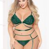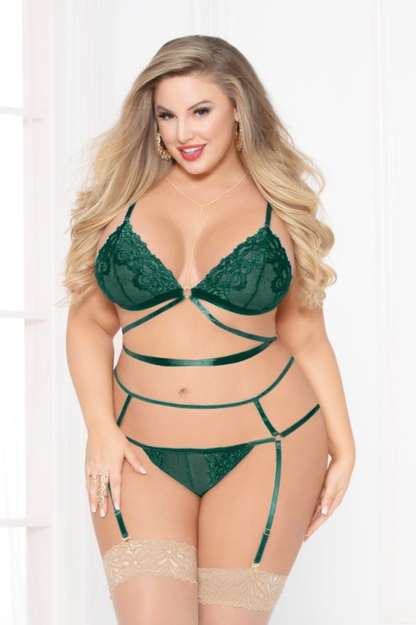 Three piece bra set. Lace triangle bra with satin ribbon bondage underbust ties, adjustable straps, hook and eye back closure, gold hardware, removable chain necklace, and strappy panty with attached garters