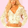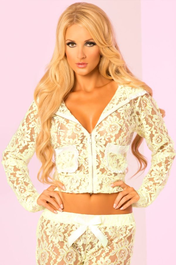 Super soft stretch-lace zip hoodie, giant lace hood with satin trim, pockets with satin trim.100% polyester