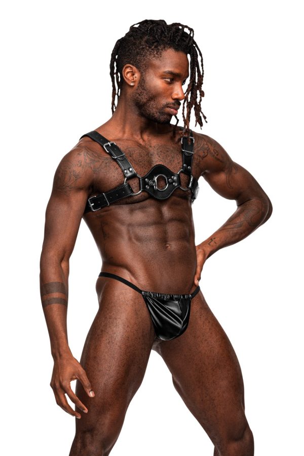 From the Leather collection by Male Power, this style includes a chest harness featuring an oval front opening with metal rings, fully adjustable buckled straps, metal studs. Soft Nubuck Leather with Polyurethane coating, heavy metal rings, buckles, and studding. Do Not Wash, Do Not Bleach, Do Not Tumble Dry