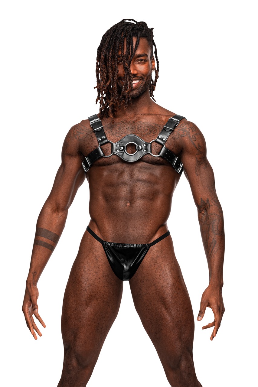 From the Leather collection by Male Power, this style includes a chest harness featuring an oval front opening with metal rings, fully adjustable buckled straps, metal studs. Soft Nubuck Leather with Polyurethane coating, heavy metal rings, buckles, and studding. Do Not Wash, Do Not Bleach, Do Not Tumble Dry