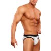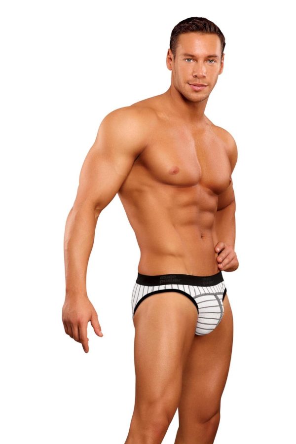 Stretch lo rise panel bikini features classic pouch, classic brief sides and back, decorative striped stitching and signature Male Power plush elastic waistband and trim.
