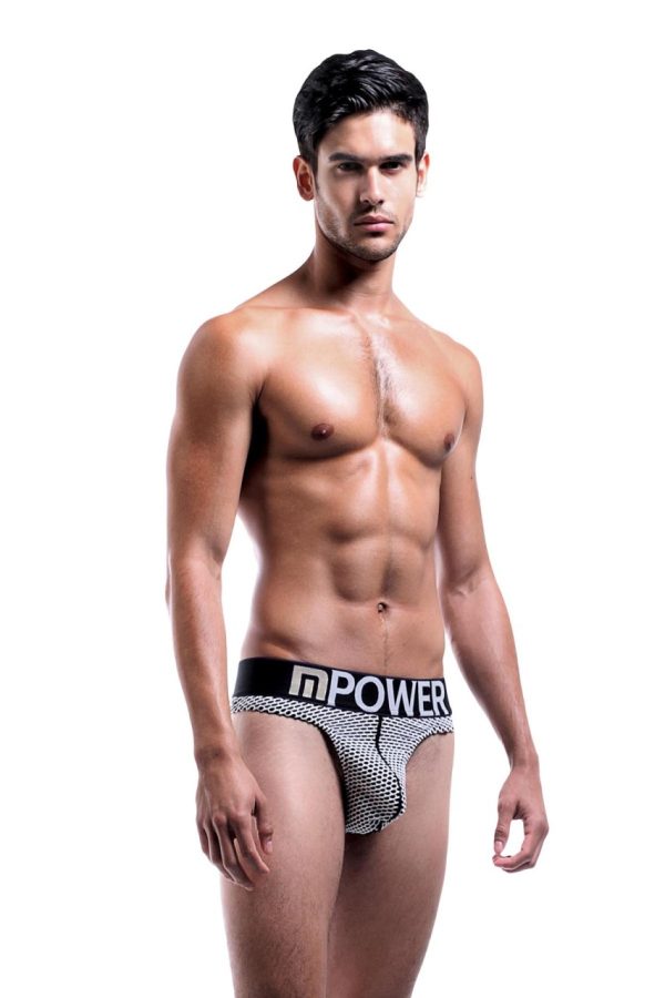 Low rise thong with decorative stitched pouch, bold printed logo’d waistband.