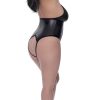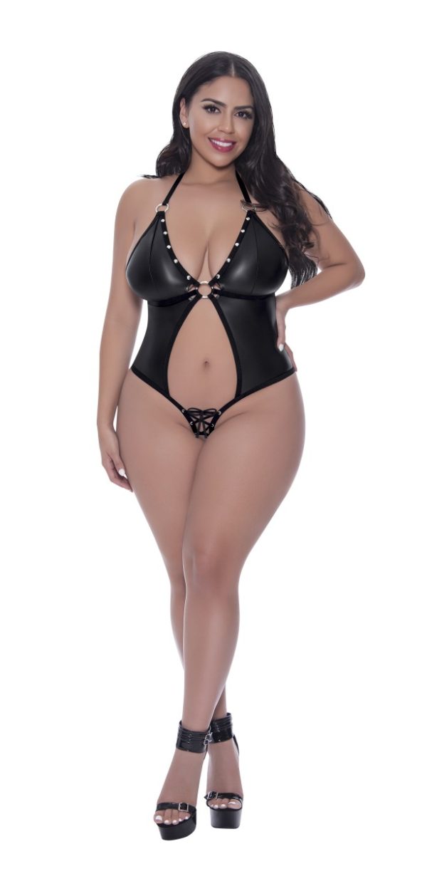 From the Lust Fetish collection by Magic Silk, this style includes: an Open Crotch Teddy with nickel plated rings, grommets and studs, elastic stretch lacing, stretch elastic halter neck with clip closure for comfort. 85% Polyester 15% Spandex