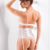 Madison is a unique 3 piece white set made from beautiful and delicate lace. This set consists of a bra suspender belt and a thong. The bra has a bow on the front and is fastened at the back with adjustable hooks. The suspender belt is stiffened with boning and is fastened at the back with adjustable hooks. Bra and suspender straps are adjustable. The thong is decorated with a front bow. Also available in black. Madison arrives packaged in her own Irall box with lovely matching tissue paper.