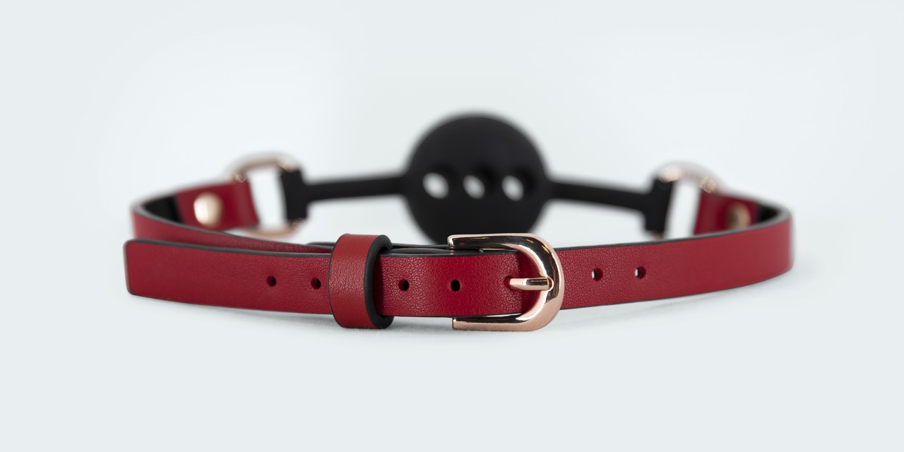 From the PU Leather accessories collection, this style features the ball mouth gag with an adjustable buckled head band, and a rubberized Ball Gag with connectors. Metal buckle, D-rings and studs adorn this style. Polyurathane coated split Nubuck leather
