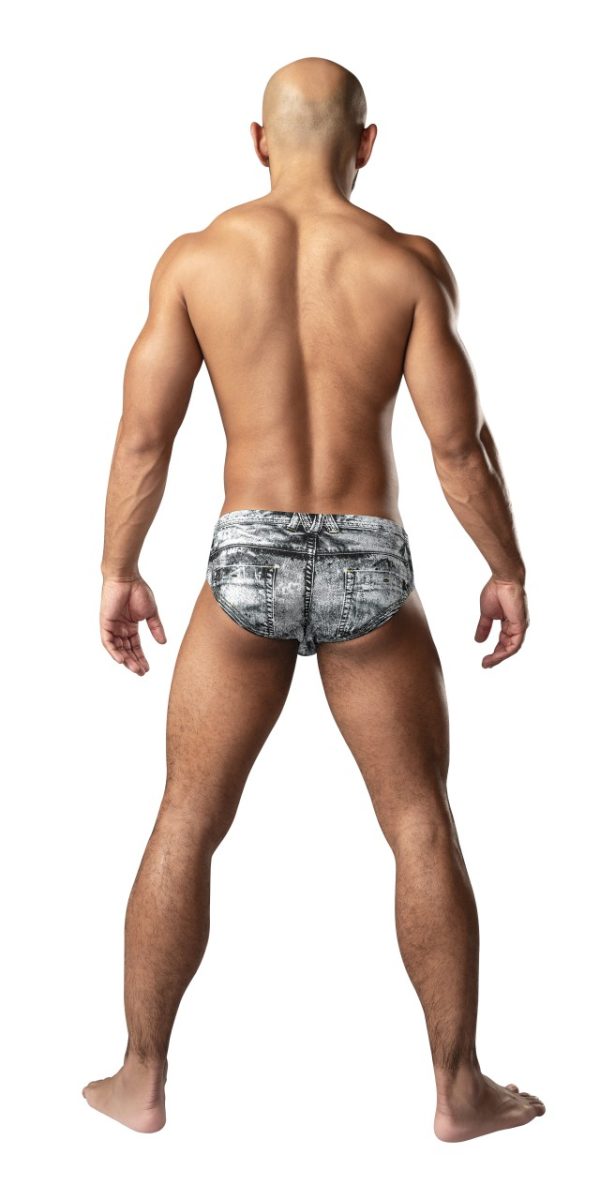 From the Dirty Denim collection by Male Power, the Bikini, with a denim jean print, depicting a faux zipper, pockets and belt loops. Contoured pouch, mid rise waist and full rear coverage. 94% Cotton, 6% Spandex