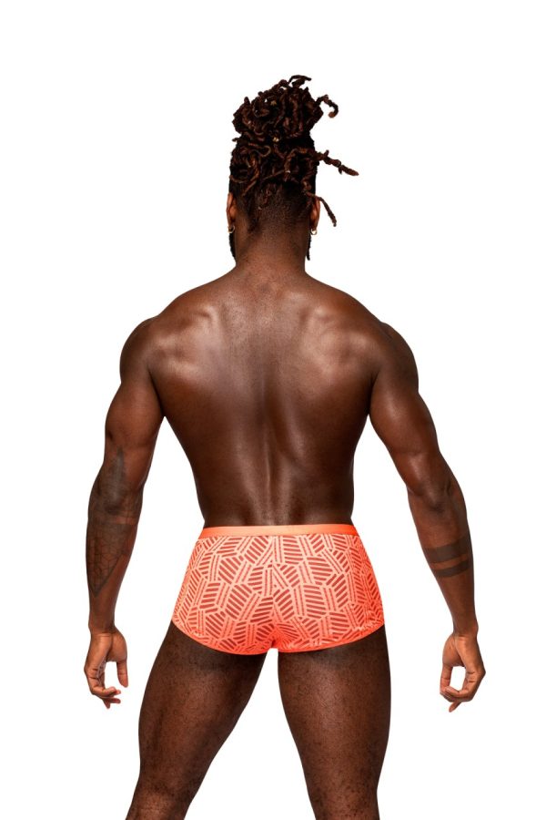 From the Rude Awakening collection by Male Power, the Cheeky Cutout Short features very high cut legs with a cutout window above the pouch. Color coordinating satin straps and gold ringed waistband.