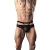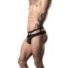 From the Lucifer collection by Male Power, the Cut Out Strappy Thong is low waisted and secured to the waistband by three plush elastic straps. The pouch is secured in front for uplift.