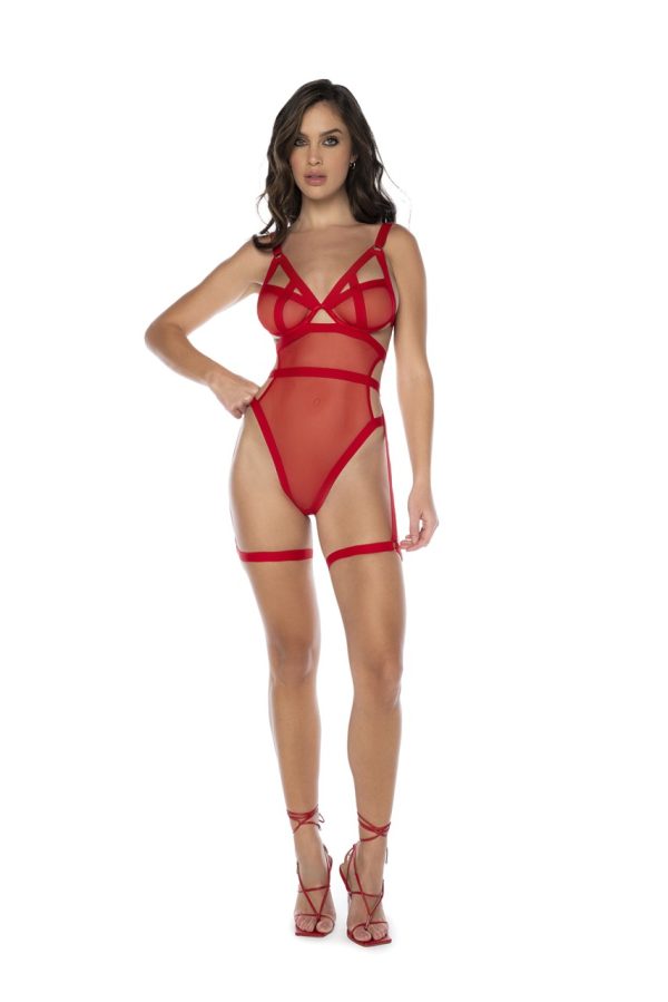 This transparent mesh bodysuit with elastic band details will accentuate your figure like no other. It has an underwire for greater support, adjustable straps and crotch fastening.
