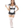 This playful and flirty French maid costume features a mini dress with an open back, front lace-up design, and mesh trim, along with a separate apron and lace headpiece for the perfect touch of charm.