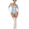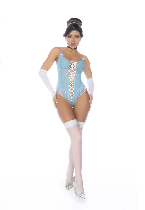 Straight from a fantasy, this midnight curfew princess costume includes five pieces: an underwire bodysuit with adjustable straps, front lace-up design, and hook-and-eye crotch closure, along with mitts, a neckpiece, and a ribbon headpiece for a truly enchanting look.