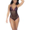 Romantic fishnet bodysuit with lace cups, contrasting trim details, and a halter neckline. Complete the look with the matching gloves included.
