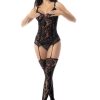 Set trends in this iconic floral fishnet one-piece, with lace up detail on the back, attached garters and connected stockings.
