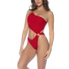 This one-shoulder one-piece swimsuit features a striking cut-out design through the center, enhanced with gold ring details for a touch of luxury. It offers an adjustable back and thong-style bottom for a flattering fit.