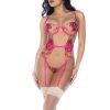 This bodysuit hugs your curves flawlessly, crafted from vibrant floral embroidered mesh. It features underwire, adjustable straps, attached garters, and a seductive lace-up back detail for an irresistible, customizable fit.