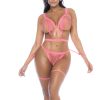 Turn up the heat with this playful two-piece set in a vibrant wet-look pink. It features top with an open-cup design with fringe details, a matching fringe bottom with attachable garter straps and wrist cuffs.