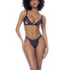 Look and feel like a goddess wearing this three-piece set in a cotemporary lace. Bralette with semi-open cups & adjustable straps, matching garter belt and thong.