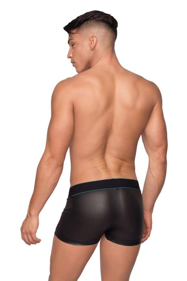 Mini short, fully lined pouch with cut out overlay and decorative stitching, plush wide logo’d waistband