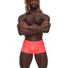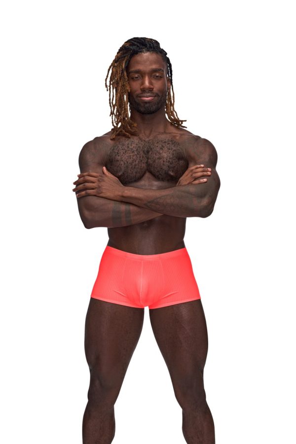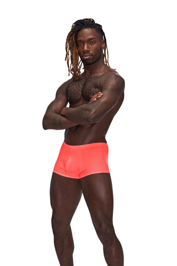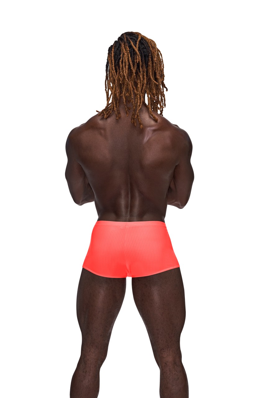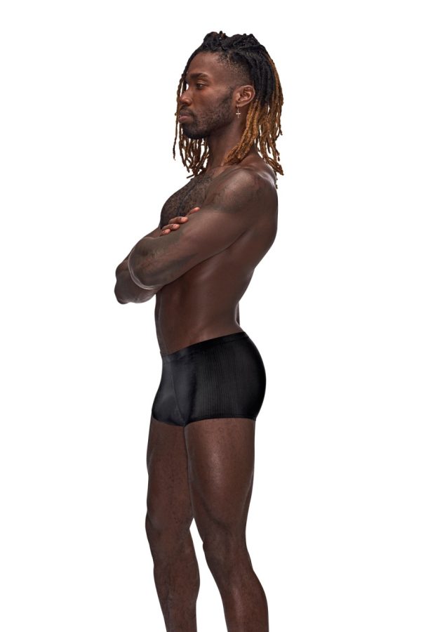 From the Barely There collection by Male Power, the Mini Short features a low cut waist, high cut legs and a generous contoured pouch. Silky smooth, supple poly spandex. Ultra lightweight with tone on tone verticle striping. Hand wash separately, cold water, line dry, no bleach