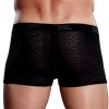 Textured semi sheer mini short features comfort fit pouch, plush elastic tone on tone waistband with Male Power Logo.