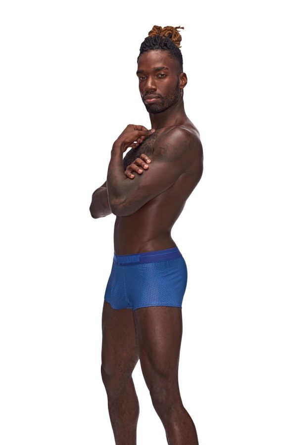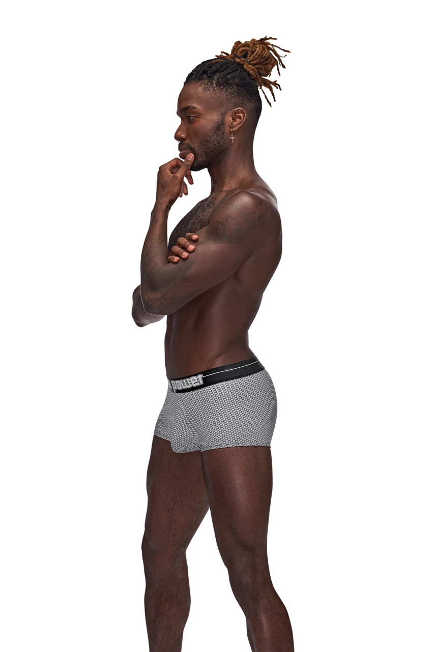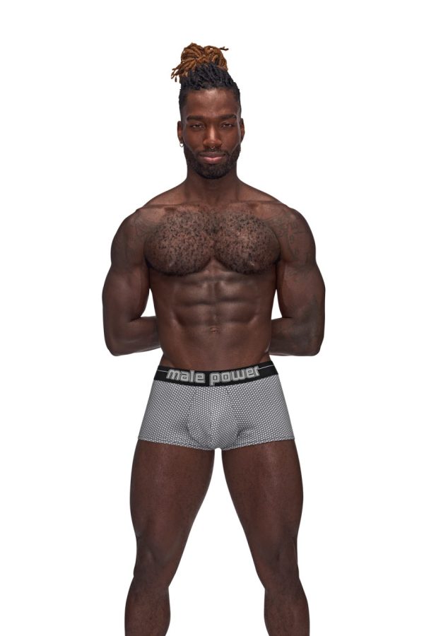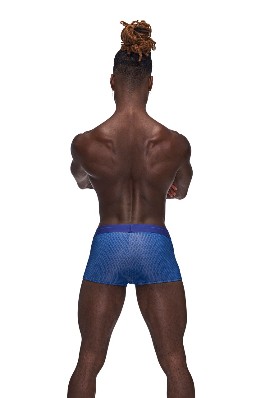 From the Sexagon collection by Male Power the Mini Short features a low cut waist, high cut legs, contour pouch and a plush branded printed waistband. Poly spandex hexagon print fabric with micro pin hole perforations for moisture wicking and cool breathability, plush branded elastic waistband. Hand wash separately, cold water, line dry, no bleach