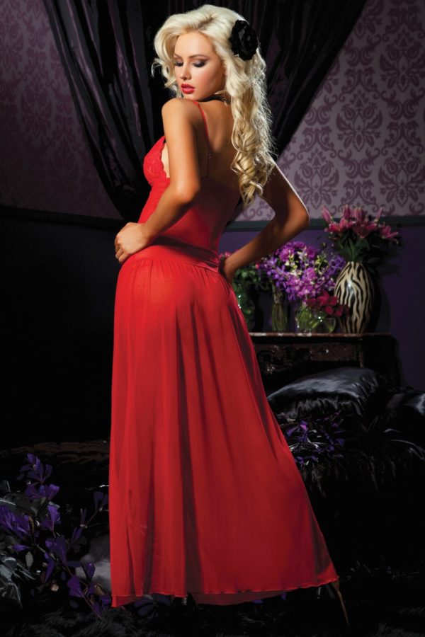 Mesh floor-length gown, lace triangle cup, adjustable straps, lace front panel, center slit, and thong