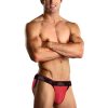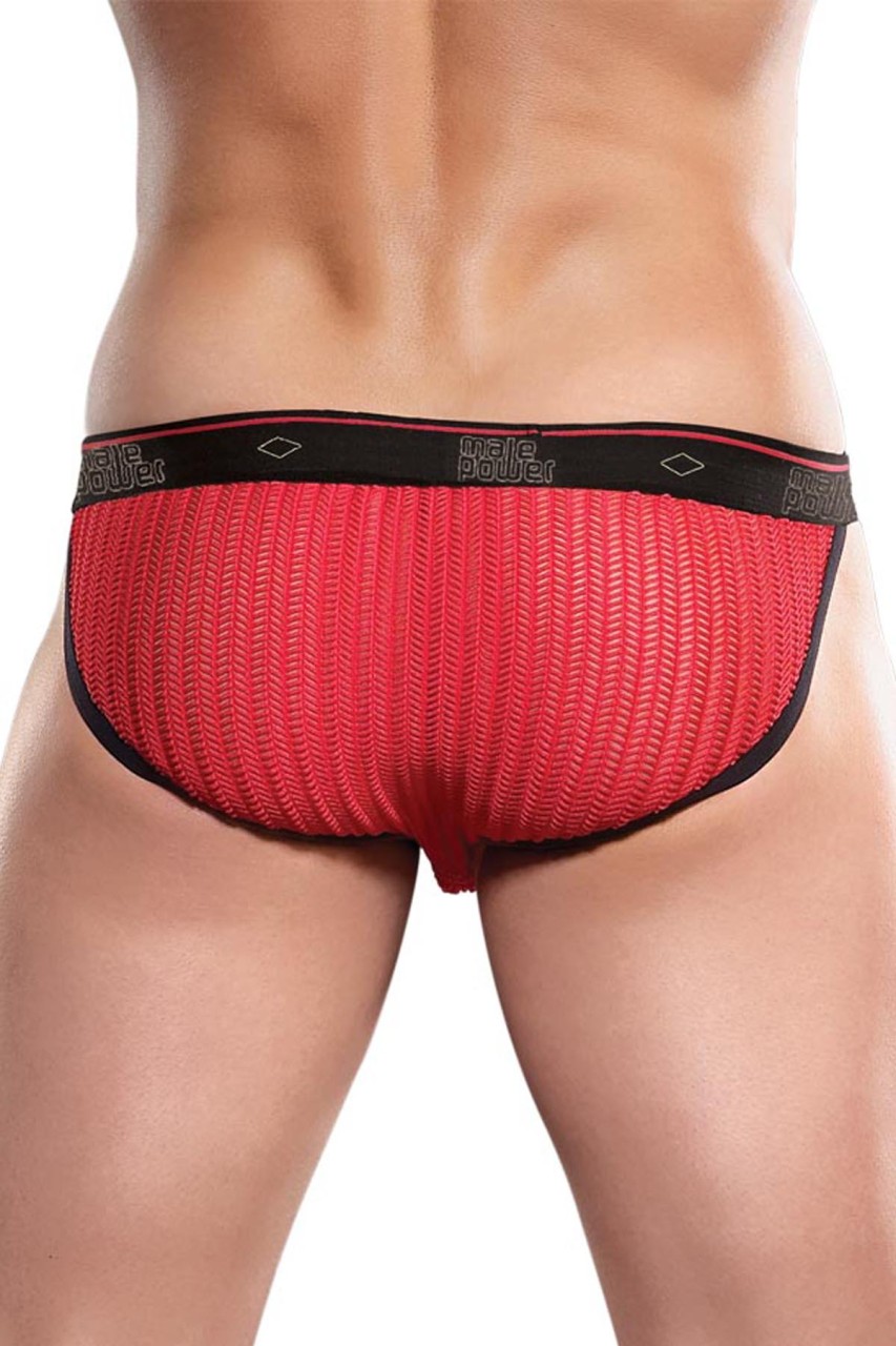 Crocheted mustang bikini features classic pouch with brief back, sexy open sides and Male Power branded plush elastic waistband and plush elastic trim.