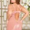 Cross-dye lace, mesh and microfiber chemise with strappy lace soft underwire cups, satin bow accents, adjustable shoulder straps, hook and eye closure, removable garters, and g-string.