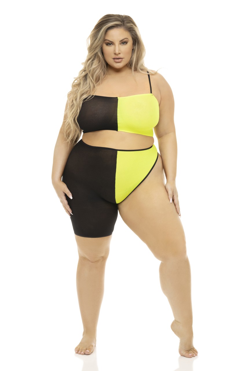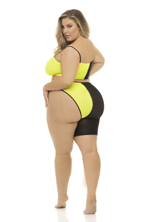 Very daring bra and open string set designed to flatter the lines of the figure and leave nothing to the imagination! Made with elastic straps and decorated in bows adorned with beautiful rhinestones. Garter included. Gloves not included. This item arrives packed in a Provocative box.