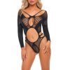 Pretty boobless bodystocking with different complementary patterns. three quarter sleeves and bows! Item arrives boxed. Please note the thong is not included.
