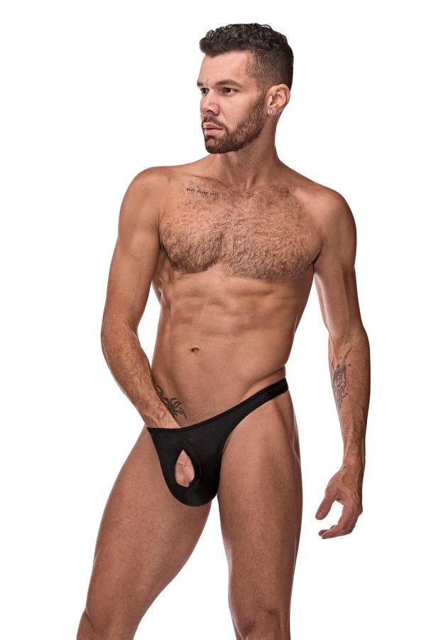 Stretch thong features contour pouch with detachable velcro tab, classic thong back and plush elastic waistband and trim.