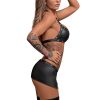 A bra featuring velcro neck and sliding butterfly clip closure in back. A mini skirt featuring functional zipper slits and a matching g-string.