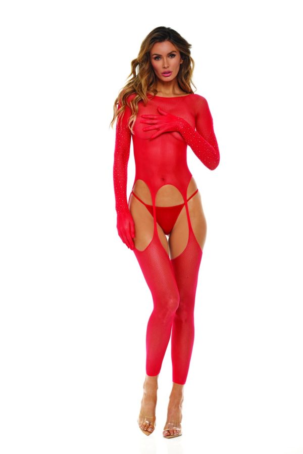 Shine bright and celebrate your curves with this stunning plus-size long-sleeved, crotchless bodystocking, adorned with sparkling diamante accents! Designed to hug your figure in all the right places, this sheer, stretchy piece combines elegance with a touch of daring. The open crotch detail adds a playful edge, while the long sleeves bring a hint of sophistication. Perfect for a night when you want to feel sexy, confident, and completely unforgettable, this bodystocking is made to embrace your curves and let you sparkle! Please note the thong is not included.