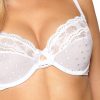 A beautiful soft cup bra with a pretty bow in the centre. This soft cup bra has a two-sectional cup construction with gorgeous lace at the top of the cup. The bottom half of the cup is decorated with transparent mesh with subtle polka dots. The cups are underwired with adjustable shoulder straps and the bra can be fastened at the back with a hook and eye fastening. This item arrives packaged in a lovely Roza box making it ideal as a gift or special treat. The Lagerta collection comprises of a push up bra, soft cup bra, thong or brief all available in black or white. Each piece is sold separately to maximise the mix and match options. Please see the ‘Related Products’ tab below to see other combinations.
