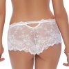 Mela is a romantic pair of boxer briefs with fancy floral lace detailing on the front and the rear. Features a touch of Lurex thread here and there adding sparkle to the briefs. With an elasticated waistband above sits this beautiful lace which scallops across the edge. A scalloped pattern also can be found on the back edges. Lastly the gusset area is manufactured with cotton on the inside and a soft shiny material on the outer side. Available in black and cream. Mela arrives packaged in her own branded Roza box with lovely tissue paper.