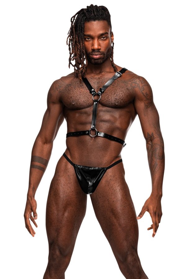 From the Leather collection by Male Power, this style includes a double ring torso harness with adjustable buckled straps and decorative bat wings in back with metal rings and buckles. Soft Nubuck Leather with Polyurethane coating, heavy metal rings, buckles, and studding. Do Not Wash, Do Not Bleach, Do Not Tumble Dry