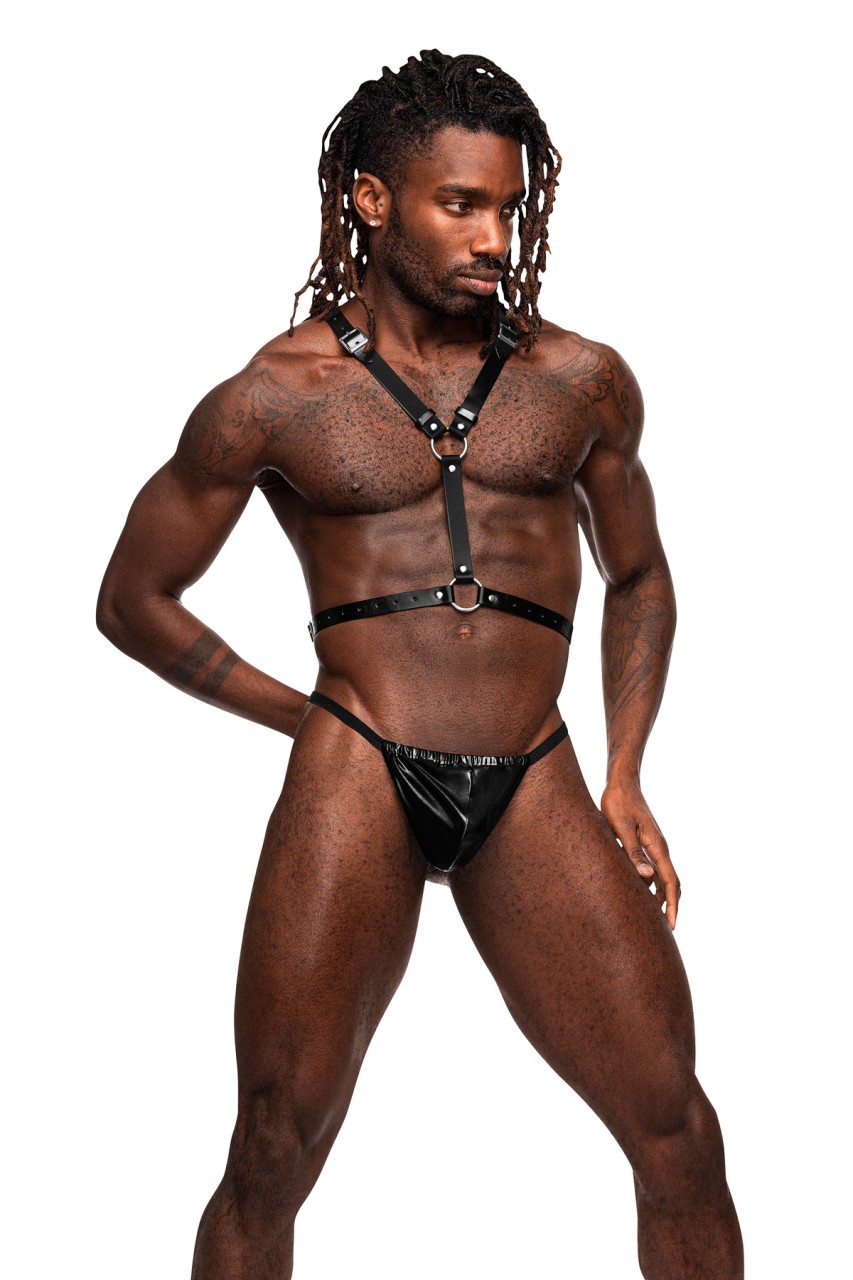 From the Leather collection by Male Power, this style includes a double ring torso harness with adjustable buckled straps and decorative bat wings in back with metal rings and buckles. Soft Nubuck Leather with Polyurethane coating, heavy metal rings, buckles, and studding. Do Not Wash, Do Not Bleach, Do Not Tumble Dry