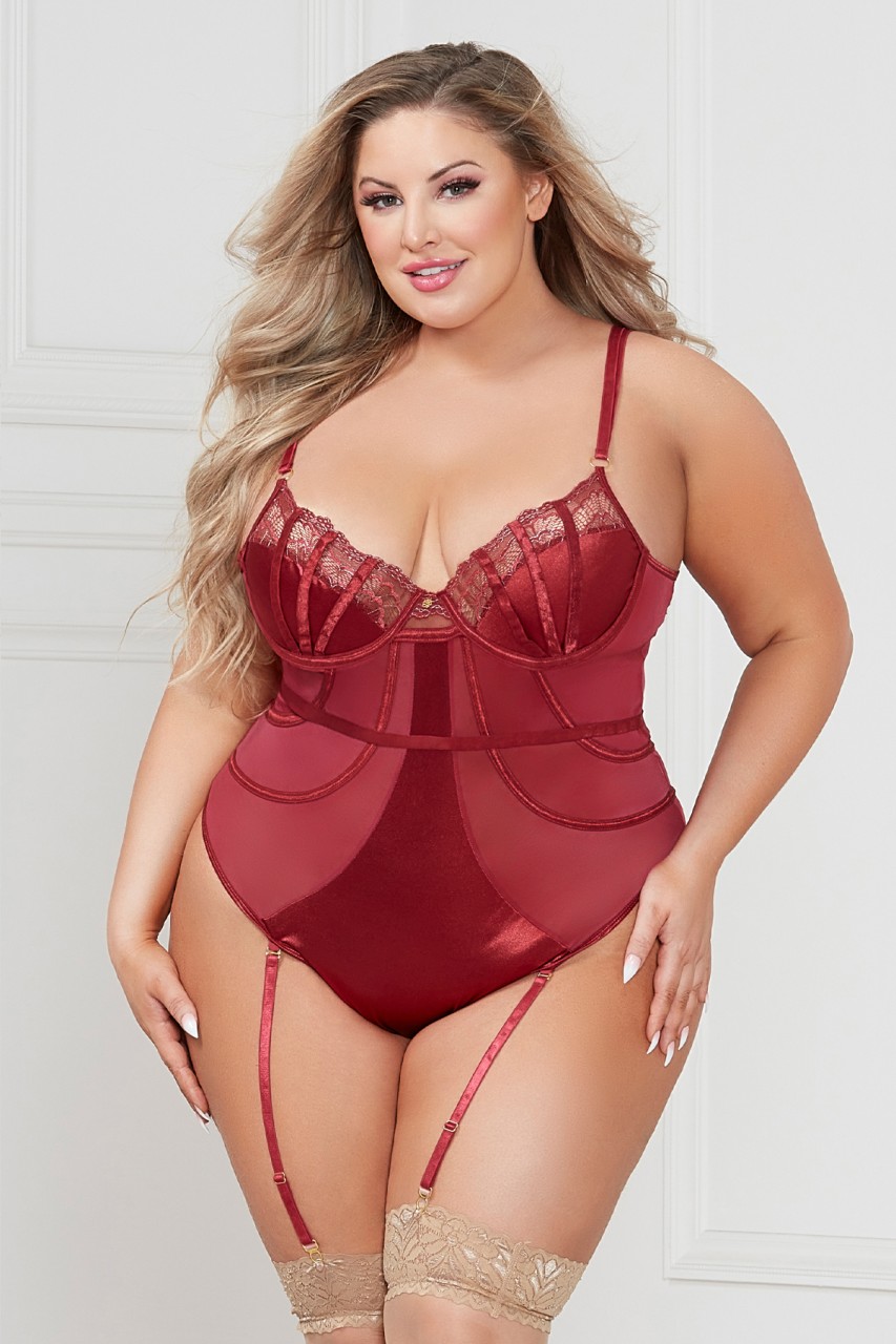 Lurex lace, satin, and mesh teddy with underwire, adjustable straps, satin channeling, gold floral charm, hook back, snap crotch, and removable garters. 90% NYLON, 10% ELASTANE