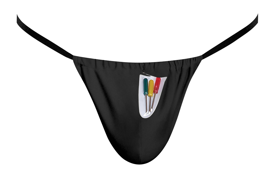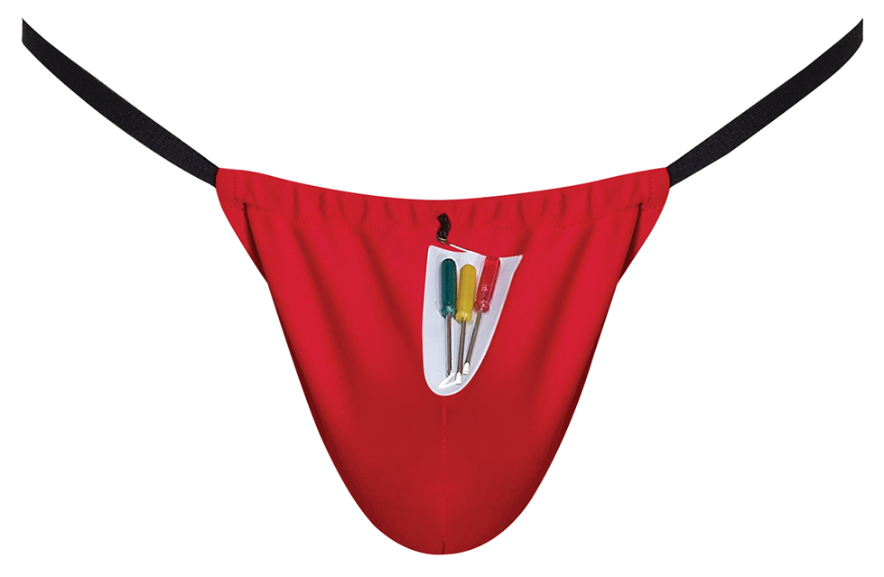 From the Novelty collection by Male Power, this style includes: A g-string featuring a comfort fit pouch that has a set of three functional mini-screwdrivers attached, an elastic waistband and g-string back. Stretchy polyester, spandex blend is cool and comfortable Hand wash separately, cold water, line dry. Do not bleach.