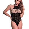 From the Seamless collection by Magic Silk, this style includes: A sexy teddy that features a stretch halter neck, strappy cage bra and flowing stripe fabric details. This stretchy style can conform to any body type and is extremely flattering! Super stretchy and conforming seamless black fabric. Hand wash, cold. No Bleach. Dry flat. 90% Nylon, 10% Spandex