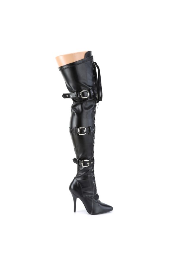 5″” (127mm) Heel Ribbon Lace-Up Front Triple Buckle Strap Stretch Thigh High Boot, Full Inner Side Zip Closure