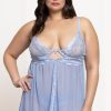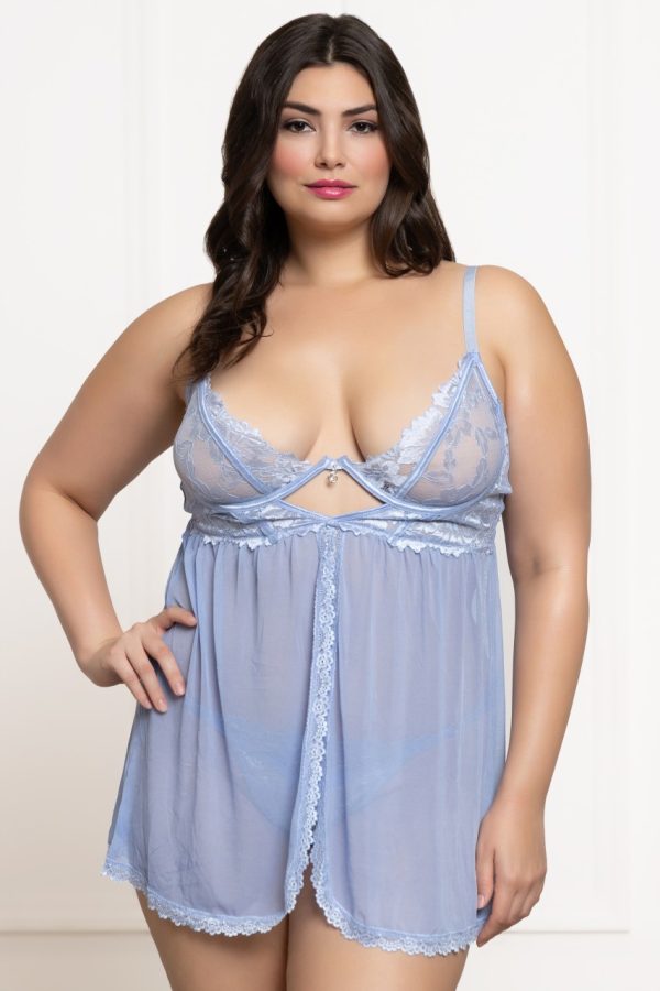 Two piece babydoll set. Lace and mesh babydoll with underwire, center front charm, hook and eye back, adjustable straps, flyaway front, and panty