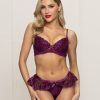 Two piece bra set. Embroidered lace bra with underwire, gold chain detail, hook and eye back, satin rosette, gold hardware, and skirted g-string