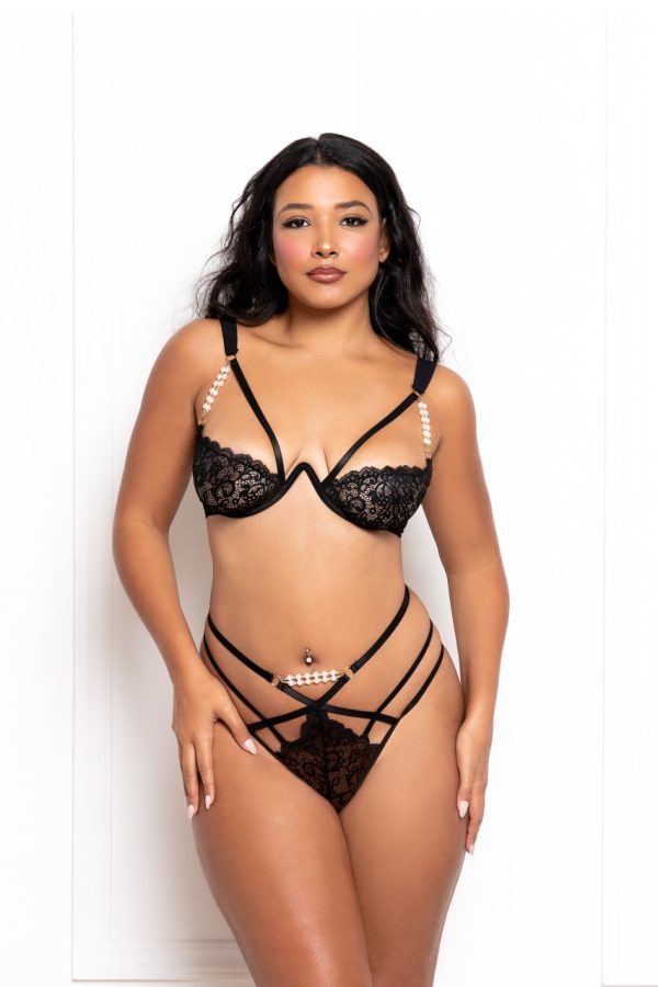 Very daring bra and open string set designed to flatter the lines of the figure and leave nothing to the imagination! Made with elastic straps and decorated in bows adorned with beautiful rhinestones. Garter included. Gloves not included. This item arrives packed in a Provocative box.